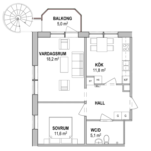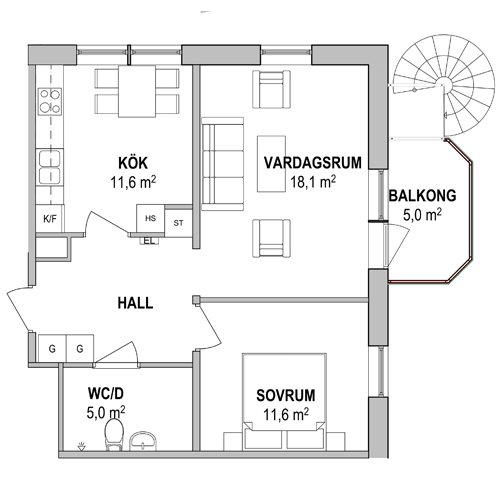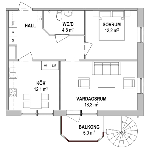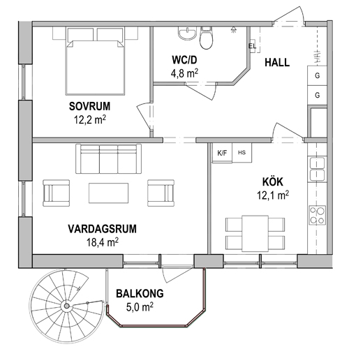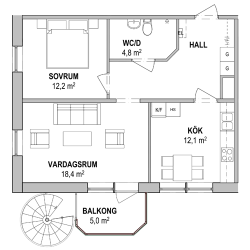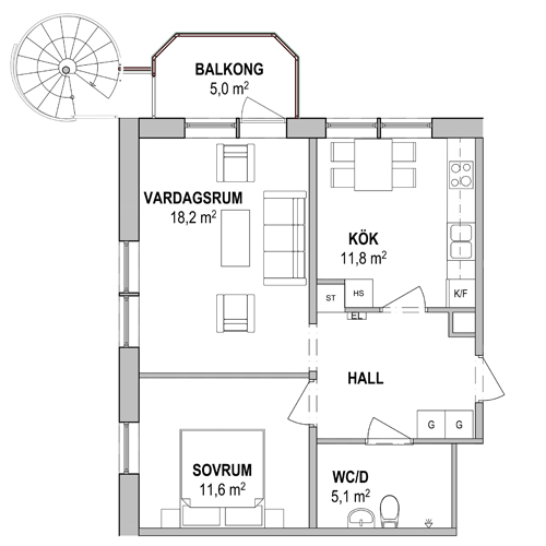 Här finns 2:or med balkong eller uteplats. Spiraltrappan intill balkongen används endast som en alternativ utrymningsväg.