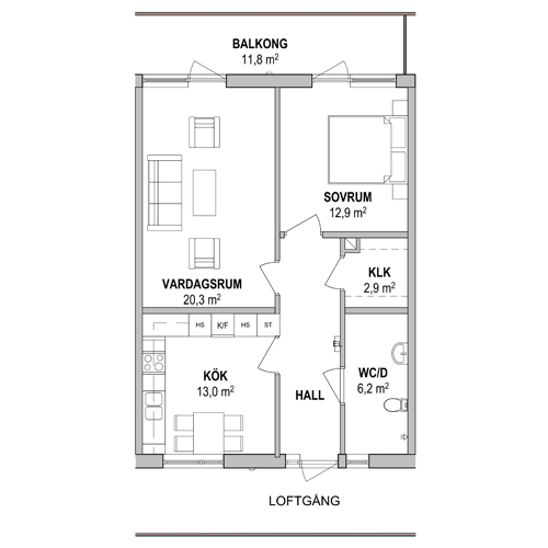 Det finns 8 bostäder med 2 rum och kök i hus B. Samtliga har balkong eller uteplats.